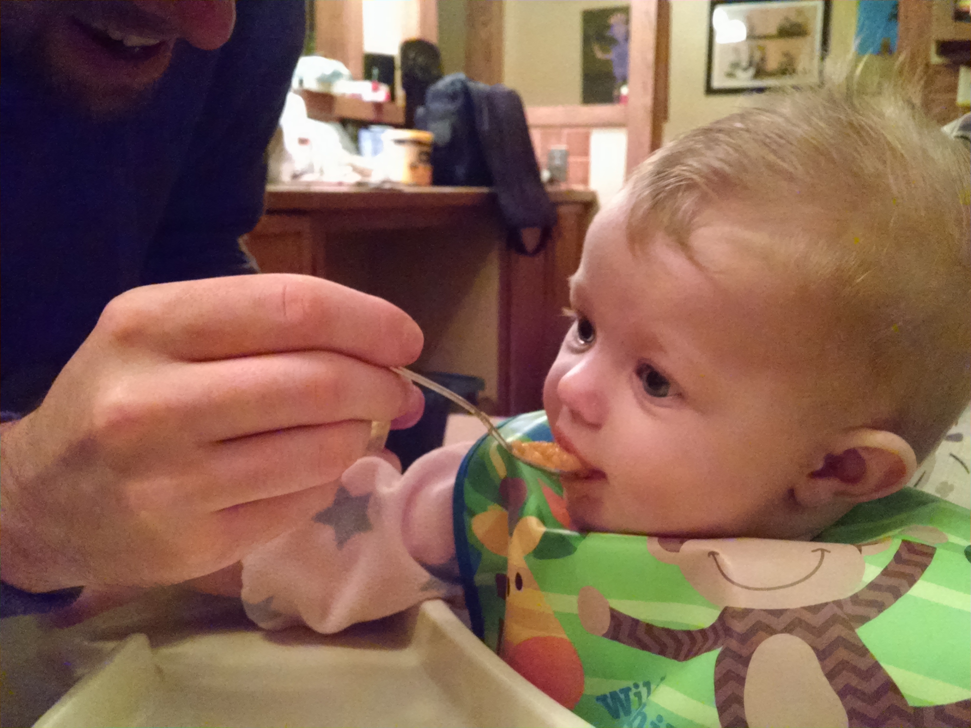 *I’m sure eventually she will actually eat the food we give her. Right now there is a lot of opening the mouth and then pushing the goods right back out with the tongue.