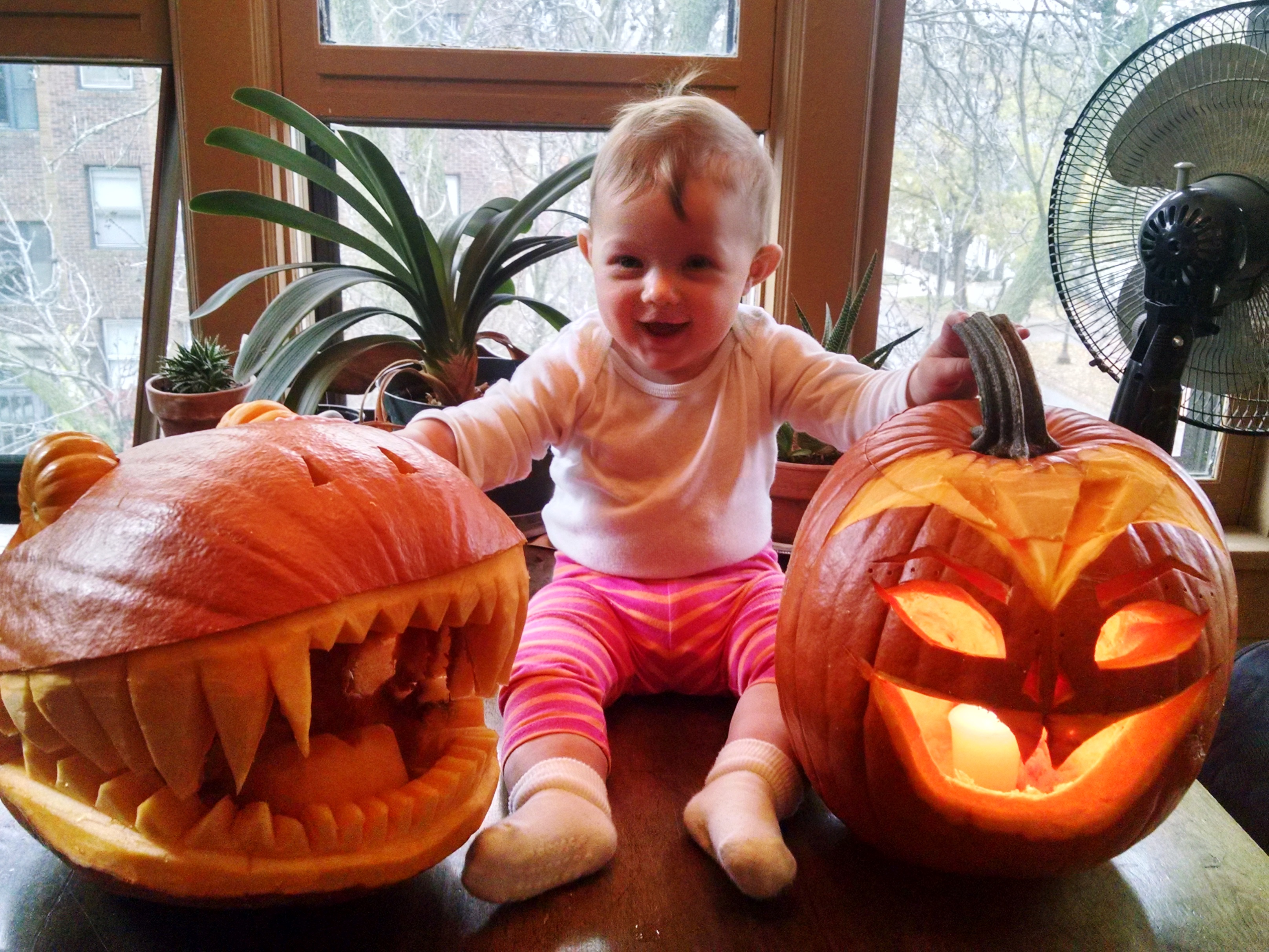 Saturday was Ada’s first Halloween. For quite some time, I really thought about going all out and dressing her up as a flapper… or Charlie Chaplin… or something else amazing. The holiday got closer and closer and I gave up, telling myself it was OK to downplay everything this year since Ada 1) will never remember it and 2) can’t even dream about enjoying the fruits of her trick-or-treating labor at this point.